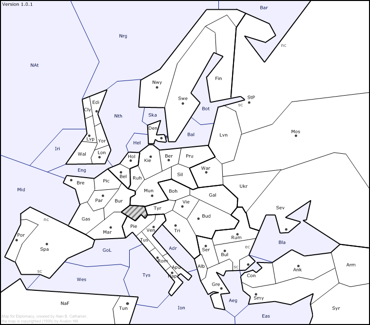This is a website about the boardgame Diplomacy by Avalon Hill. Currently you'll only find picture files of the standard map I've created. Later you may also find different stuff here, such as links and software for diplomacy.